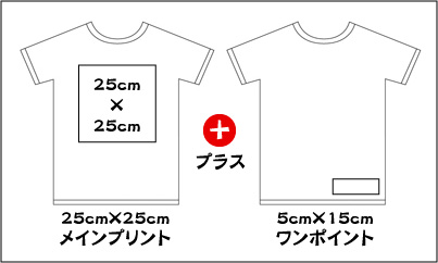 オリジナルTシャツ 1枚から制作致します!! プリントサイズは、25cm×25cm【1色】が1箇所と、 5cm×15cm【1色】が1箇所の、計2箇所パック!! お好きな場所にプリント出来ます。